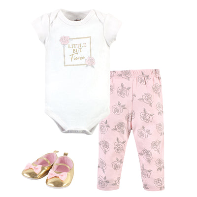 Little Treasure Cotton Bodysuit, Pant and Shoe Set, Dk. Pink Gold Rose