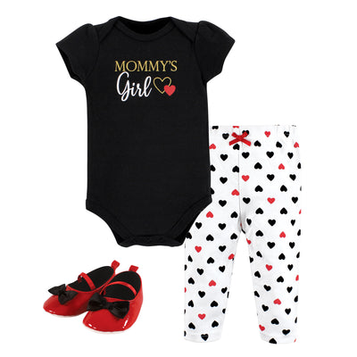 Hudson Baby Cotton Bodysuit, Pant and Shoe Set, Girl Mommy Red Black