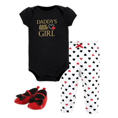 Hudson Baby Cotton Bodysuit, Pant and Shoe Set, Girl Daddy Red Black